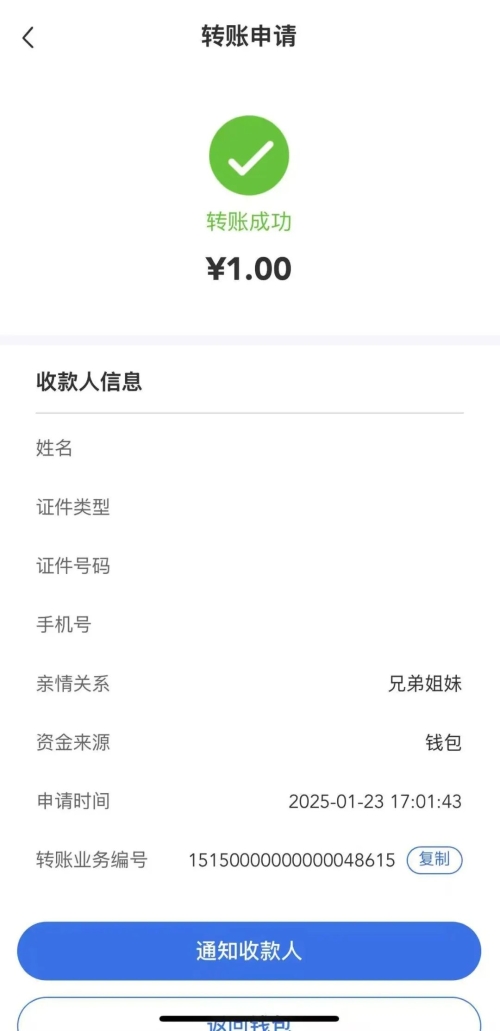 2、醫(yī)保錢包轉(zhuǎn)賬時,若被轉(zhuǎn)賬醫(yī)保錢包賬戶未開立,則如下圖所示: